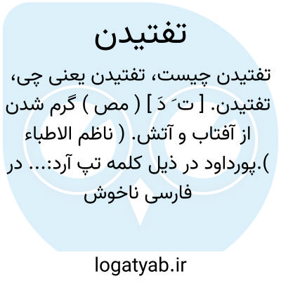 تفتیدن. [ ت َ دَ ] ( مص ) گرم شدن از آفتاب و آتش. ( ناظم الاطباء ).پورداود در ذیل کلمه تپ آرد:... در فارسی ناخوشی تب و... تافته و تفسیدن و تفتیدن و جز اینها از همین بنیاد است. ( فرهنگ ایران باستان ص 90 ). رجوع به تابه و تابش و تاب و تب و تفت و تفته و تفسیدن و تافته شود.