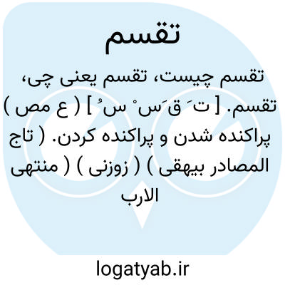 تقسم. [ ت َ ق َس ْ س ُ ] ( ع مص ) پراکنده شدن و پراکنده کردن. ( تاج المصادر بیهقی ) ( زوزنی ) ( منتهی الارب ) ( آنندراج ) ( ناظم الاطباء ) ( از اقرب الموارد )، یقال: تقسمهم الدهر فتقسموا؛ ای فرقهم فتفرقوا. ( لازم و متعدی است ). ( منتهی الارب ) ( ناظم الاطباء ) ( اقرب الموارد ). || پریشان کردن اندوه خاطر کسی را. ( از اقرب الموارد ): دل نگران شدند و چنانکه عادت مشفقان است تقسم خاطر آورد و اندیشه بهر چیز کشید. ( کلیله و دمنه چ مینوی ص 184 ). که اگر این هجر اتفاق افتد به تقسم خاطر و التقات ضمیر کشد و شادمانگی و بسطت آن گاه مهنا گردد که اتباع و پیوستگان را از آن نصیبی باشد. ( کلیله و دمنه ایضاً ص 296 ).