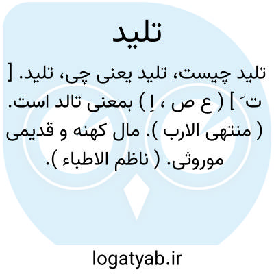 تلید. [ ت َ ] ( ع ص، اِ ) بمعنی تالد است. ( منتهی الارب ). مال کهنه و قدیمی موروثی. ( ناظم الاطباء ). مال قدیمی از حیوان و جز آن که از پدران به ارث رسیده باشد. ( از ذیل اقرب الموارد ). خلاف طارف و طریف. ( یادداشت به خط مرحوم دهخدا ). مال کهنه و قدیمی موروثی... طریف مال نو که مقابل تلید است: