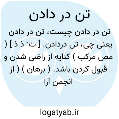 تن دردادن. [ ت َ دَ دَ ] ( مص مرکب ) کنایه از راضی شدن و قبول کردن باشد. ( برهان ) ( از انجمن آرا ) ( از آنندراج ) ( از فرهنگ رشیدی ) ( از غیاث اللغات ). راضی شدن. ( از شرفنامه منیری ). حاضر شدن برای امری و قبول کردن کاری. ( از فرهنگ فارسی معین ). تن اندردادن: