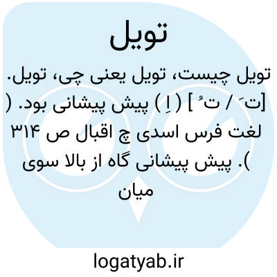تویل. [ت َ / ت ُ ] ( اِ ) پیش پیشانی بود. ( لغت فرس اسدی چ اقبال ص 314 ). پیش پیشانی گاه از بالا سوی میان سر بود و چکاد نیز همین باشد و به تازی چون آنجا موی نروید اصلع خوانندش... ( لغت فرس اسدی چ دبیرسیاقی ص 122 ). پیشانی بود. ( فرهنگ جهانگیری ). پیشانی و بعضی به معنی تارک سر گفته اند. ( فرهنگ رشیدی ). کسی را گویند که بر بالای پیشانی او مو نباشد و او را به عربی اصلع خوانند و به ضم اول بالای پیشانی و فرق سر و تارک سر راگویند... ( برهان ). پیشانی از افراز سر. ( شرفنامه منیری ). از بالای پیشانی آنجا که موی برنیاید و اصلع بود. ( اوبهی ). کسی را گویند که بر بالای پیشانی او موی نباشد، و پیشانی و تارک سر را نیز گویند. ( انجمن آرا ) ( آنندراج ): اصلع؛ یعنی کسی که بر بالای پیشانی وی موی نباشد. بالای پیشانی و فرق سر و تارک سر. ( ناظم الاطباء ). در نسخ مختلف لغتنامه اسدی معانی ذیل برای این صورت ( تویل ) آمده است. پیش پیشانی، پیش پیشانی سوی چکاد، پیش پیشانی گاه از بالا سوی میان سر و چکاد نیز همین باشد و به تازی چون آنجا موی نروید اصلع خوانندش. پیشانی باشد از افراز سر چون چکاد و بیت [ غواص ] را شاهد می آورند... این کلمه را برهان، گذشته از معنی فوق به معنی اصلع آورده است در این بیت انسب است و ممکن است اصل «سرکل » بوده است. ( یادداشت بخط مرحوم دهخدا ):
