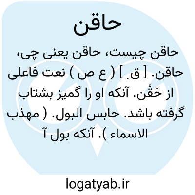 حاقن. [ ق ِ ] ( ع ص ) نعت فاعلی از حَقْن. آنکه او را گمیز بشتاب گرفته باشد. حابس البول. ( مهذب الاسماء ). آنکه بول آمده را نگاه دارد، یقال: لا رأی لحاقن. و فی المثل: و انا منه کحاقن الاهالة؛ یعنی ماهر و حاذقم به آن، و اهاله پیه گداخته باشد. ( منتهی الارب ): عبدالرحمن گفت من حاقنم بکنار بام باید شد، هر دو بکنار بام شدند عبدالرحمن خویشتن را از بام فروافکند. ( تاریخ سیستان ). || هلال ٌ حاقن؛ ماه نوکه هر دو کناره وی بسوی بالا باشد. ( منتهی الارب ).