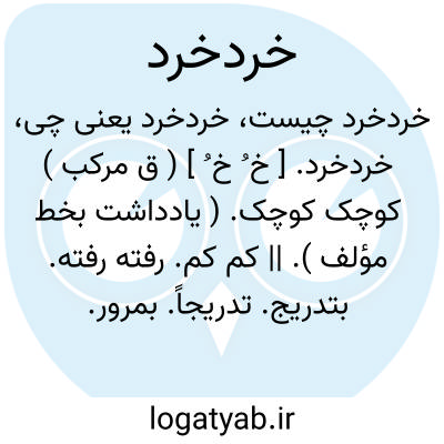 خردخرد. [ خ ُ خ ُ ] ( ق مرکب ) کوچک کوچک. ( یادداشت بخط مؤلف ). || کم کم. رفته رفته. بتدریج. تدریجاً. بمرور. متدرجاً. آهسته آهسته. ( یادداشت بخط مؤلف ):