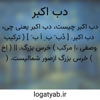 دب اکبر. [ دُب ْ ب ِ اَ ب َ ] ( ترکیب وصفی،اِ مرکب ) خرس بزرگ. || ( اِخ ) خرس بزرگ ازصور شمالیست. ( التفهیم ). صورت چهارم از صور شمالیه ٔفلکی قدماء و آنرا بنات نعش کبری نیز گویند. ( مفاتیح العلوم ). بنات النعش کبری. صورتی از صورتهای فلکی و به خرس بزرگ مانند کرده اند و آن بیست وهفت ستاره است بر صورت و هشت ستاره است بر پیرامون صورت. نام یکی از صور فلکی شمالی و نعش یا سریر و بنات النعش کبری و عناق و قائد و سها در این صورت واقعست و صورت را بفارسی هفتورنگ مهین گویند. هفت برادران کلان. دختران نعش بزرگ.هفتورنگ. کوکب قطبی. صورت کلان خرس است از ترکیب کواکب شمالی قریب قطب شمال و آنرا بنات النعش کبری گویند. ( از غیاث اللغات ). نام صورتی از صور فلکیه از ناحیه شمالی و آنرا بصورت خرسی توهم کرده اند بزرگتر از دب اصغر و کواکب او بیست وهفت است و از جمله کواکب وی هفت کوکب است که عرب او را بنات النعش کبری خوانند و چهار بر بدن اوست و سه بر ذنب او و آنرا که بر طرف ذنب است قائد خوانند و آن دیگر را که بدو نزدیکترست عناق خوانند و آن دیگر که به رستن جای ذنب جون خوانند و بنزدیک عناق کوکبی است خرد او را سها خوانند. ( از جهان دانش ). از جمله صور کواکبی است و از کواکب او بیست وهفت در صورت اند و هشت در حوالی آن و چهار از آن جمله که بر شکل مربع مستطیل واقعند و روشن با سه که بر ذنب اند بنات النعش کبری خوانند و آنرا که در میانست عناق و آن را که بر اصل ذنب الجون و بالای عناق ستاره کوچکی باشد ملاصق بدو که از غایت صغر روشنائی چشم بدان اعتبار کنند آنرا سها خوانند و بعضی ستاره کوچک و در ذنب او کوکبی دیگر روشن باشد که آنرا قاعده خوانند و بر سه پای تحت کواکب نعش و بنات شش کوکب اند بر هر یکی دو که آنرا فقرات ظبی خوانند و هر دو را از آن فقره، بواسطه آنکه بمثابت ظلف آهو باشند و آنرا که بر پای راست بود فقره اول خوانند. صرفه کوکب روشنی است بر ذنب اسد پیوسته در پی او باشد و ظفر کوکبی چند مجتمعاند بالای صرفه که عرب آنرا هلبه و ثعبان خوانند و هفت کواکب را که سر و سینه و گردن و زانوی او باشد بشکل نصف دائره سر بنات النعش و حوض نیز خوانند و کواکبی را که برابر او و هردو چشم و گوش او باشند ظبا چنانکه گویند «ان الظبا لما قرت من الهبله وردت الحوض » و هشت کوکب دیگر را که بر حوالی صورتند دو را از آن جمله که میان هلبه و قایدند یکی روشن تر از دیگری کبدالاسد خوانند و شش دیگر را که درزیر فقره ثالثه اند سه را که روشن ترند ظبا و سه دیگر را اولاد ظبا خوانند. ( نفایس الفنون ). قبل از کشف قطب نما مردم فنیقیه راه دریائی را از دب اصغر می یافتند و دیگران از دب اکبر. ( ایران باستان ج 2 ص 1861 ).