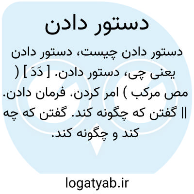 دستور دادن. [ دَدَ ] ( مص مرکب ) امر کردن. فرمان دادن. || گفتن که چگونه کند. گفتن که چه کند و چگونه کند. || سفارش دادن. || اذن دادن. رخصت دادن. اجازت دادن. روا شمردن. اجازه دادن. دستوری دادن: گفت اکنون مرا زمان دهید باز خانه شوم... گفتم مهلت نیست... گفت... پس دستور دهید تا هم اینجا وصیتی بنویسم... گفتیم رواست. ( تاریخ بیهق ).