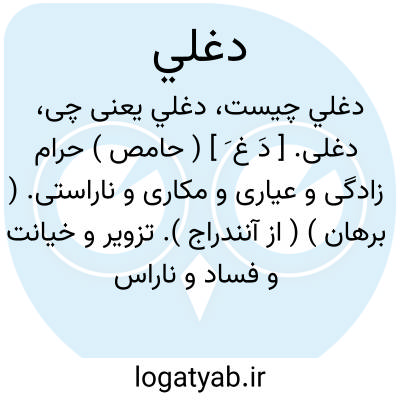 دغلی. [ دَ غ َ ] ( حامص ) حرام زادگی و عیاری و مکاری و ناراستی. ( برهان ) ( از آنندراج ). تزویر و خیانت و فساد و ناراستی و عیاری و حرامزادگی. ( ناظم الاطباء ). آرنگ. ( از برهان ).خَون. عَملة. مَغالة. ( از منتهی الارب ):