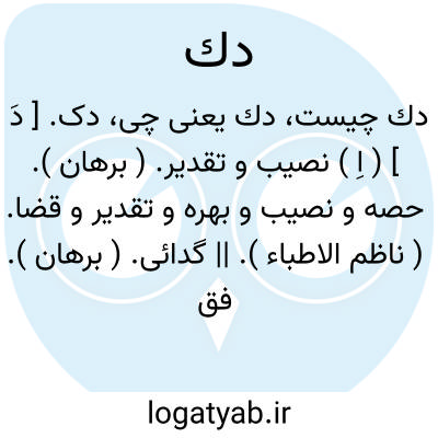 دک. [ دَ ] ( اِ ) نصیب و تقدیر. ( برهان ). حصه و نصیب و بهره و تقدیر و قضا. ( ناظم الاطباء ). || گدائی. ( برهان ). فقر و گدائی. ( ناظم الاطباء ). دق. و رجوع به دق شود. || گدا. ( برهان ). گدا و مفلس. ( ناظم الاطباء ):