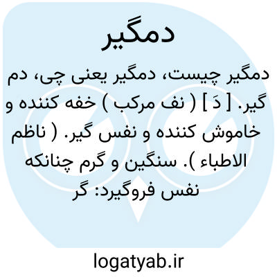 دم گیر. [ دَ ] ( نف مرکب ) خفه کننده و خاموش کننده و نفس گیر. ( ناظم الاطباء ). سنگین و گرم چنانکه نفس فروگیرد: گرمای دم گیر. خبه کننده. گیرنده ٔنفس. دمه گیر. دَوْمَهْکَر. ( معرب است ). که خفقان آرد. که سهولت تنفس را مانع باشد. با هوای خفه. ( یادداشت مؤلف ):