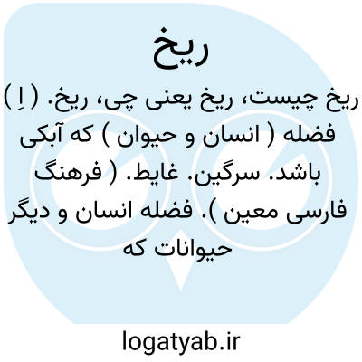 ریخ. ( اِ ) فضله ( انسان و حیوان ) که آبکی باشد. سرگین. غایط. ( فرهنگ فارسی معین ). فضله انسان و دیگر حیوانات که روان و بطور اسهال دفع شود. ( از یادداشت مؤلف ) ( ناظم الاطباء ) ( از برهان ). فضله ریق صاحب اسهال. ( ازانجمن آرا ) ( آنندراج ). نجاست. ( زمخشری ). پیخال مرغ.( غیاث اللغات ). سرگین. ( لغت فرس اسدی ):