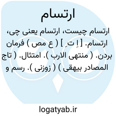 ارتسام. [ اِ ت ِ ] ( ع مص ) فرمان بردن. ( منتهی الارب ). امتثال. ( تاج المصادر بیهقی ) ( زوزنی ). رسم و فرمان بجای آوردن: در این حال روی پادشاه درباره من متغیر شد و شغل من بدیگری مفوض فرمود مرا جز امتثال و ارتسام و اطاعت روی نباشد.( ترجمه تاریخ یمینی ص 82 ). || تکبر آوردن. ( منتهی الارب ). || بزرگ شدن. || پناه جستن. ( منتهی الارب ). || بازداشت خواستن. ( منتهی الارب ). بازداشتن خواستن. || دعاء. ( تاج المصادر بیهقی ). دعا کردن بر چیزی یا عام است. ( منتهی الارب ). || تکبیر کردن. ( تاج المصادر بیهقی ). تکبیر گفتن. || نقش گرفتن. صورت پذیر شدن ( صفحه ). صورت بسته شدن در چیزی. نقش بستن.( غیاث اللغات ). || ارتسام فی اللغة الامتثال. و استعمله المنطقیون بمعنی الانطباع و الانتقاش. و هذاالتصویر المعقول بالمحسوس. کذا ذکر المولوی عبدالحکیم فی حاشیة شرح الشمسیة. ( کشاف اصطلاحات الفنون ).