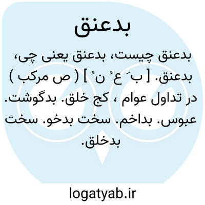 بدعنق. [ ب َ ع ُ ن ُ ] ( ص مرکب ) در تداول عوام، کج خلق. بدگوشت. عبوس. بداخم. سخت بدخو. سخت بدخلق. کژخلق. عابس. ترشروی. ( یادداشت مؤلف ).