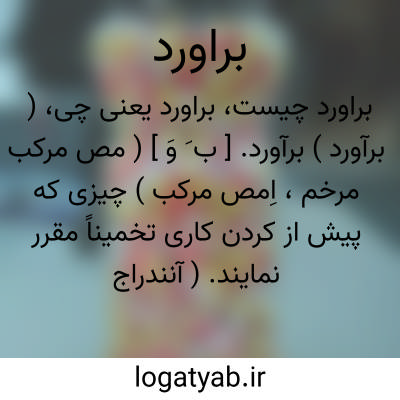 ( برآورد ) برآورد. [ ب َ وَ ] ( مص مرکب مرخم، اِمص مرکب ) چیزی که پیش از کردن کاری تخمیناً مقرر نمایند. ( آنندراج ). دید. تخمین. انگاره. اجترام. ( یادداشت مؤلف ). حزر. عمل تعیین قیمت کردن چیزی که بعربی تقویم گویند: