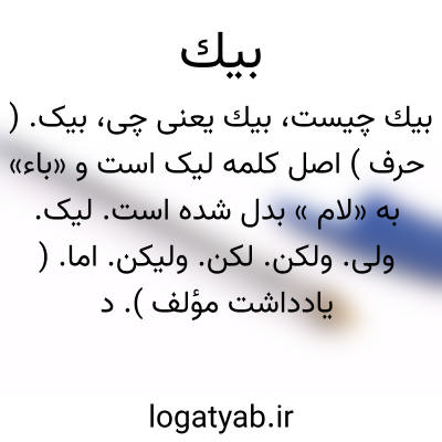 بیک. ( حرف ) اصل کلمه لیک است و «باء» به «لام » بدل شده است. لیک. ولی. ولکن. لکن. ولیکن. اما. ( یادداشت مؤلف ). در پارسی قدیم به امالت کسره باء و اکنون آن لفظ از زبانها افتاده ومهجورالاستعمال است و «باء» را به «لام » بدل کرده اند ولیکن میگویند. ( از المعجم فی معاییر اشعارالعجم ).
