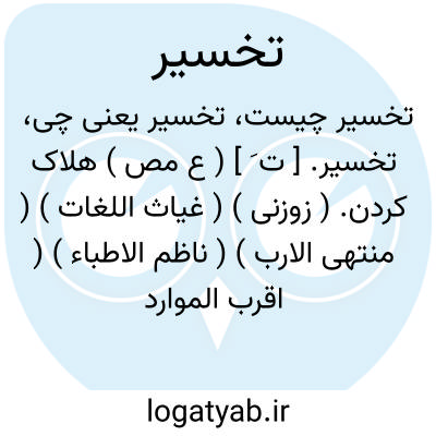 تخسیر. [ ت َ ] ( ع مص ) هلاک کردن. ( زوزنی ) ( غیاث اللغات ) ( منتهی الارب ) ( ناظم الاطباء ) ( اقرب الموارد ) ( المنجد ) ( آنندراج ): خسره ُ سوءُ عمله ِ؛ ای اهلکه ُ. ( اقرب الموارد ). || زیانکار گردانیدن. ( زوزنی ) ( ترجمان جرجانی ترتیب عادل بن علی ) ( از اقرب الموارد ). || به زیان نسبت دادن کسی را. ( اقرب الموارد ). || ضرر و زیان:... فماتزیدوننی غیر تخسیر. ( قرآن 63/11 ).