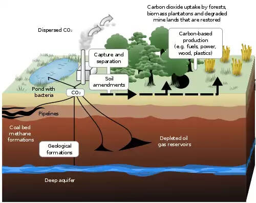 جنگل ها، جنگل کتانجک و دیگر شکل های حیات گیاهی هنگام رشد، دی اکسید کربن را از هوا جذب می کنند و آن را به زیست توده متصل می کنند. با این حال، این ذخایر بیولوژیکی به عنوان مخزن کربن فرار در نظر گرفته می شوند، زیرا نمی توان در درازمدت آن را تضمین کرد. برای مثال، رویدادهای طبیعی، مانند آتش سوزی ها یا بیماری ها، فشارهای اقتصادی و تغییر اولویت های سیاسی می توانند سبب انتشار مجدد کربن ترسیب شده در جو شوند. دی اکسید کربنی که از اتمسفر خارج شده است نیز می تواند با تزریق آن به سطح زیرین یا به شکل نمک های کربناته نامحلول ( جنس مواد معدنی ) در پوسته زمین ذخیره شود. این روش ها غیرفرار در نظر گرفته می شوند، زیرا کربن را از اتمسفر حذف می کنند و آن را به طور نامحدود و احتمالاً برای مدت قابل توجهی ( هزاران تا میلیون ها سال ) ترسیب می کنند. برای تقویت فرآیندهای ترسیب کربن در اقیانوس ها، فناوری های زیر پیشنهاد شده اند، اما هیچ کدام تاکنون به کاربرد در مقیاس بزرگ دست نیافته اند: پرورش جلبک دریایی، بارورسازی اقیانوس ها، ذخیره سازی بازالت، کانی سازی و رسوبات اعماق دریا، افزودن باز برای خنثی سازی اسیدها. در همین حال ایده تزریق مستقیم دی اکسید کربن در اعماق دریا کنار گذاشته شده است.
