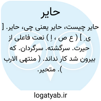 حایر. [ ی ِ ] ( ع ص، اِ ) نعت فاعلی از حیرت. سرگشته. سرگردان. که بیرون شد کار نداند. ( منتهی الارب ). متحیر. حیران. ( مهذب الاسماء ). ج، حوران. حیران. ( مهذب الاسماء ) ( اقرب الموارد ). || جای پست. || بستان. ( منتهی الارب ). اصمعی گوید: مطمئن و وسط بلنداطراف. ج، حوران. موضعی ( معجم البلدان ) ( اقرب الموارد ). مجتمعالماء و حوض یسیَّب الیه مسیل ُ ماء الامطار. ( اقرب الموارد ). گرداب. گوباران. ( مهذب الاسماء ). مغاکی که آب باران در او گرد آید در دشت. ( منتهی الارب ). حوضی که آب باران در آن گرد شود، چه آب در آن متحیرانه چرخ زند. حوض که آب سیل و باران بدان ریزد و گرد آن متحیرانه بچرخد. و بیشتر مردم آنرا حَیْر خوانند چنانکه عایشة را عَیْشة گویند. ( معجم البلدان ).
