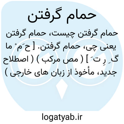 حمام گرفتن. [ ح َم ْ ما گ ِ رِ ت َ ] ( مص مرکب ) ( اصطلاح جدید، مأخوذ از زبان های خارجی ) حمام رفتن. استحمام کردن. بدن خود را شستشو دادن. ( فرهنگ فارسی معین ).