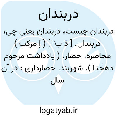 ز خصم او به شهر خصم باشد قحط و دربندان.قطران.در این مدت که دربندان بود،بقدر صدهزار آدمی بیش یا کم از درد پای و دهان و دندان هلاک شدند. ( تاریخ سیستان ). به درهای شارستان جنگ آغاز کردند و هر روز به دو وقت حرب بود و این دربندان مدت هشت ماه بماند. ( تاریخ سیستان ). چون نزدیک بیت المقدس رسید [ عمر ] جمله لشکریان و سرداران... که به محاصره و دربندان ایلیا مشغول بودند، امیرالمؤمنین را استقبال کردند. ( ترجمه تاریخ اعثم کوفی ).