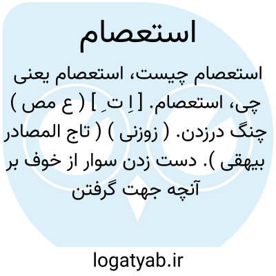 استعصام. [ اِ ت ِ ] ( ع مص ) چنگ درزدن. ( زوزنی ) ( تاج المصادر بیهقی ). دست زدن سوار از خوف بر آنچه جهت گرفتن سازند. ( منتهی الارب ). دست در چیزی زدن از خوف افتادن. || طلب عصمت کردن. || بازداشتن. ( منتهی الارب ). || بازایستادن. ( زوزنی ). واایستادن. واایستیدن. ( تاج المصادر بیهقی ).