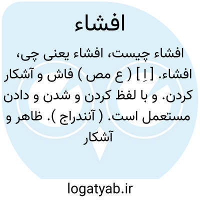 افشاء. [ اِ ] ( ع مص ) فاش و آشکار کردن. و با لفظ کردن و شدن و دادن مستعمل است. ( آنندراج ). ظاهر و آشکار کردن. ( از بهارعجم ). بمعنی پراکنده گردانیدن و فاش کردن خبر و جز آن باشد. ( ناظم الاطباء ). || افزون شدن شتران پراکنده. ( ناظم الاطباء ). افزون شدن ستوران و مال و متاع. ( آنندراج ). || بزرگ منشی کردن. گردن کشی کردن. ( ناظم الاطباء ).