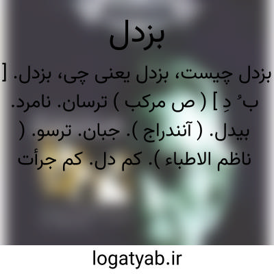 بزدل. [ ب ُ دِ ] ( ص مرکب ) ترسان. نامرد. بیدل. ( آنندراج ). جبان. ترسو. ( ناظم الاطباء ). کم دل. کم جرأت. آهودل. اشتردل. بددل. کبک زهره. کلنگ دل. گاودل. گاوزهره. مرغ دل. ( یادداشت بخط دهخدا ). نامرد.بیدل. سیماب دل. اشتردل. ( مجموعه مترادفات ص 351 ).
