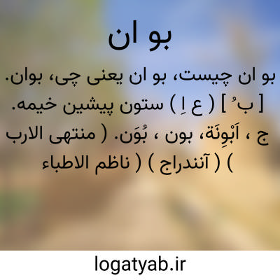 بوان. [ ب ُ ] ( ع اِ ) ستون پیشین خیمه. ج، اَبْوِنَة، بون، بُوَن. ( منتهی الارب ) ( آنندراج ) ( ناظم الاطباء ) ( از اقرب الموارد ).