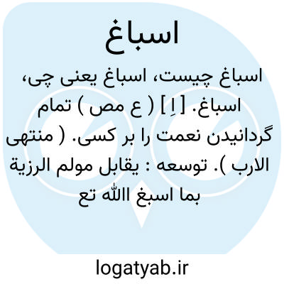 اسباغ. [ اِ ] ( ع مص ) تمام گردانیدن نعمت را بر کسی. ( منتهی الارب ). توسعه: یقابل مولم الرزیة بما اسبغ اﷲ تعالی علیه من الصبر. || تمام کردن. ( تاج المصادر بیهقی ) ( غیاث ). کامل کردن. ( کنزاللغات ) ( غیاث ). || رسانیدن آب وضو را به مواضع آن. تمام آوردن وضو را: اسبغ الوضوء؛ اذا بلغه مواضعه و فی کل عضو حقه. ( منتهی الارب ). || زره فراخ پوشیدن. ( آنندراج ).