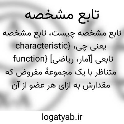 {characteristic function} [آمار، ریاضی] تابعی متناظر با یک مجموعۀ مفروض که مقدارش به ازای هر عضو از آن مجموعه برابر یک و در خارج آن مجموعه برابر صفر است