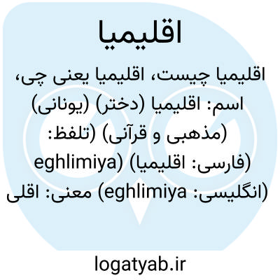 اسم: اقلیمیا (دختر) (یونانی) (مذهبی و قرآنی) (تلفظ: eghlimiya) (فارسی: اقلیمیا) (انگلیسی: eghlimiya)