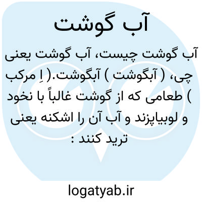 ( آبگوشت ) آبگوشت.( اِ مرکب ) طعامی که از گوشت غالباً با نخود و لوبیاپزند و آب آن را اشکنه یعنی ترید کنند: