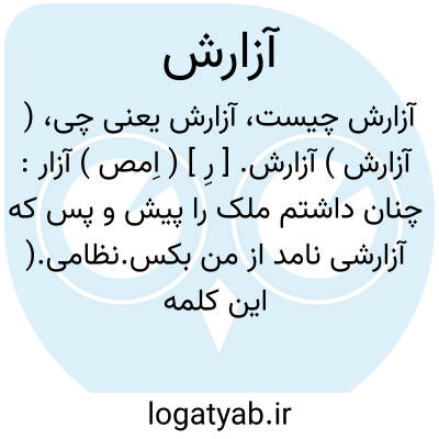 ( آزارش ) آزار، آزردگی، رنجش: چنان داشتم ملک را پیش و پس / که آزارشی نامد از کس به کس (نظامی۵: ۱۴/۹ ).