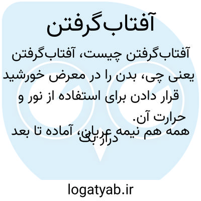 بدن را در معرض خورشید قرار دادن برای استفاده از نور و حرارت آن. همه هم نیمه عریان، آماده تا بعد دراز بکشند بر چمن سبز روشن و... آفتاب بگیرند. «گلشیری»