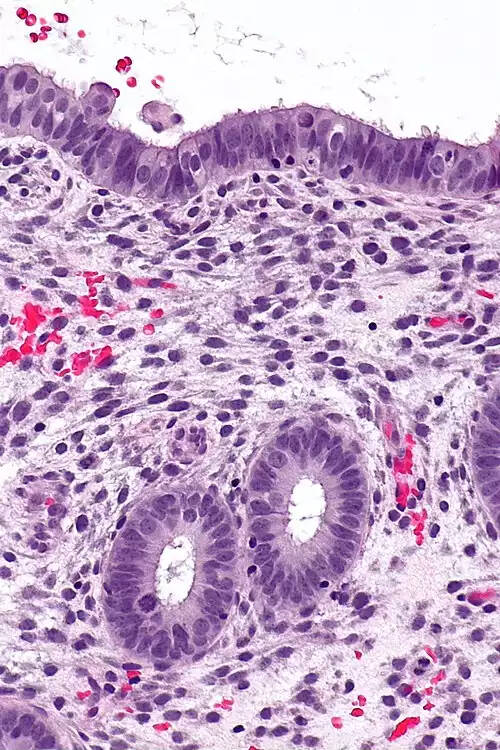 آندومتر. آندومتر یا اِندومتریوم ( نام علمی: endometrium ) که به آن آستر رحم، آستر زهدان یا درون زه لاد هم گفته می شود. لایه ای پوششی است که سطح داخلی رَحِم را می پوشاند. این لایهٔ همراه با غشاء مخاطی، داخل رحم ( زِهدان ) پستانداران و به عبارتی دیوارهٔ داخلیِ رحم است. آندومتر به شدت به دو هورمون زنانهٔ استروژن و پروژسترون واکنش نشان می دهد. تحت تأثیر استروژن، ضخیم تر شده ( مرحلهٔ فولیکولی ) و تحت تأثیر پروژسترون، غدد مخاطیِ آن بیشتر می شود ( مرحلهٔ ترشح ). در همین فاز ( مرحله ) است که یک سلول تخم لقاح یافته می تواند در بافت رحم یا آندومتر جای گیرد که به لانه گزینی معروف است. اگر تخمک بارور نشود، غلظت پروژسترون پایین می افتد و آندومتر ضخیم و بالغ که دست نخورده باقی مانده، طی دورهٔ قاعدگی فرومی ریزد.
