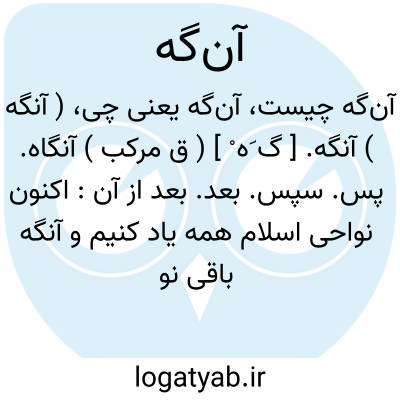 ( آنگه ) آنگه. [ گ َه ْ ] ( ق مرکب ) آنگاه. پس. سپس. بعد. بعد از آن: اکنون نواحی اسلام همه یاد کنیم و آنگه باقی نواحی کافران یاد کنیم. ( حدودالعالم ). و اندر وی [ اندر نصیبین ] چشمه ها است بسیار و از آن چشمه ها پنج رود برخیزد و بیک جای گرد شود و آن را خابور خوانند و آنگه اندر فرات افتد. ( حدودالعالم ).