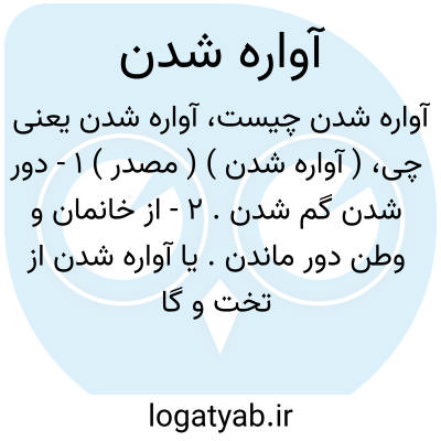 ( آواره شدن ) ( مصدر ) ۱ - دور شدن گم شدن. ۲ - از خانمان و وطن دور ماندن. یا آواره شدن از تخت و گاه. از سلطنت دور ماندن از تاج و تخت دور ماندن.