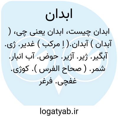 ( آبدان ) آبدان.( اِ مرکب ) غدیر. ژی. آبگیر. ژیر. آژیر. حوض. آب انبار. شمر. ( صحاح الفرس ). کوژی. غفچی. فرغر:
