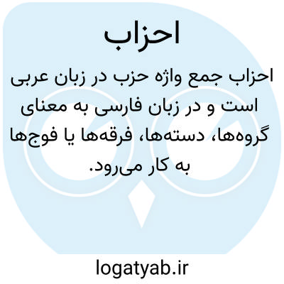 ( اَ ) [ ع. ] ( اِ. ) جِ حزب. ۱ - گروه ها، دسته ها. ۲ - گروه های کافران، شامل برخی از قبایل عرب، مانند قریش، غطفان و بنی قریظه، که با هم متحد شده به جنگ پیامبر رفته بودند. ۳ - هر گروه سیاسی که مرام و مسلکِ ویژه خود را دارد.