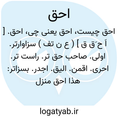 احق. [ اَ ح َق ق ] ( ع ن تف ) سزاوارتر. اولی. صاحب حق تر. راست تر. احری. اقمن. الیق. اجدر. بسزاتر: هذا احق منزل بترک.
