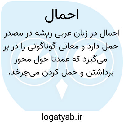 احمال در زبان عربی ریشه در مصدر حَمْل دارد و معانی گوناگونی را در بر می‌گیرد که عمدتاً حول محور برداشتن و حمل کردن می‌چرخد. یکی از معانی اصلی آن در متون کلاسیک، یاری رساندن به فردی در جهت بار نهادن یا برداشتن بار است، که در تاج المصادر به صورت یاری دادن در بار برنهادن تعریف شده است. همچنین، یک اصطلاح خاص در زمینه دامداری و مامایی وجود دارد که به احمال مراءة یا ناقه اشاره دارد؛ این عبارت به فرآیند روان شدن و ریختن شیر از پستان زن یا شتر ماده، پیش از زمان مقرر یا بدون آنکه حاملگی یا آبستنی رخ داده باشد، اطلاق می‌گردد.