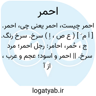 احمر. [ اَ م َ ] ( ع ص، اِ ) سرخ. سرخ رنگ. ج، حُمر، احامر: رجل احمر؛ مرد سرخ. || احمر و اسود؛ عجم و عرب، از آنکه غالب بر لون عجم بیاض و حمرتست و غالب بر لون عرب سواد. قوله علیه السلام: بعثت الی الاسود و الاحمر؛ ای العرب و العجم. || سپید. ( از اضداد است ). || زر. || زعفران. || مرد سخت. ( مؤیدالفضلا ). || گوشت. ( منتهی الارب ). گوشت سخت و زشت. ( غیاث ). || می. || مقتول. ( غیاث اللغات از منتخب ). || مرد بی سلاح در جنگ. آنکه با او سلاح نبود. ( مهذب الاسماء ) ( مؤید الفضلاء ). ج، حمر، حُمران. || نوعی از خرما. || خلوق.