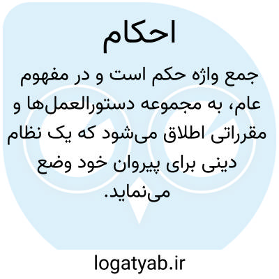 ( ا َ ) [ ع. ] (اِ. )جِ حکم.۱ - رأی ها، دستور - ها. ۲ - مجموعة دستورالعمل های شرعی. ۳ - آداب، رسم ها. ۴ - مجموعة قوانین و مقرراتی که به ارادة محکوم علیه قابل تغییر است.