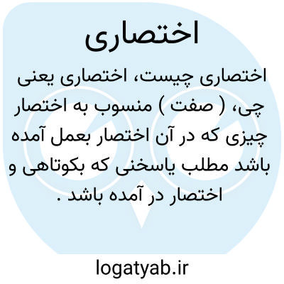 ( صفت ) منسوب به اختصار چیزی که در آن اختصار بعمل آمده باشد مطلب یاسخنی که بکوتاهی و اختصار در آمده باشد. یا عمت اختصاری. نشانی که کلمه یا سخنی یا مطلبی را بکوتاهی نمایش میدهد مث ( رک ) عمت اختصاری ( رجوع کنید ) و ( ص ) عمت اختصاری ( صلی الله علیه ) است. یا عیم اختصاری. نشانهایی که به کوتاهی گویای سخن یا مطلب یا کلمه ایست یا نشان. اختصاری.