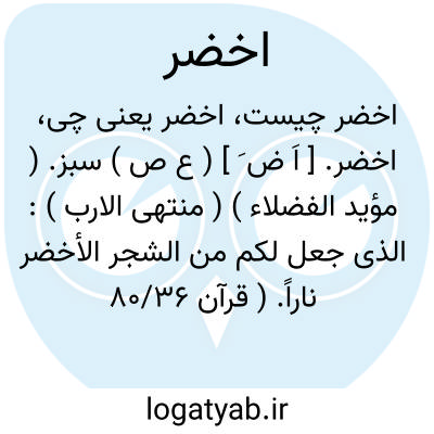 اخضر. [ اَ ض َ ] ( ع ص ) سبز. ( مؤید الفضلاء ) ( منتهی الارب ): الذی جعل لکم من الشجر الأخضر ناراً. ( قرآن 80/36 ).