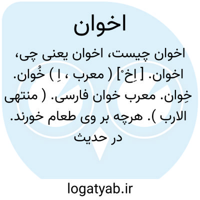 اخوان. [ اِخ ْ] ( معرب، اِ ) خُوان. خِوان. معرب خوان فارسی. ( منتهی الارب ). هرچه بر وی طعام خورند. در حدیث است «: حتی ان اهل الاخوان لیجتمعون » و رُوی الخوان.
