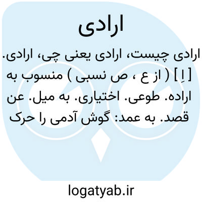 ارادی. [ اِ ] ( از ع، ص نسبی ) منسوب به اراده. طوعی. اختیاری. به میل. عن قصد. به عمد: گوش آدمی را حرکت ارادی نباشد. تنفس حیوان ارادی نیست.