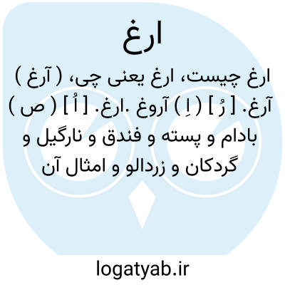 ارغ. [ اُ ] ( ص ) بادام و پسته و فندق و نارگیل و گردکان و زردالو و امثال آن را گویند که درون آن تیز و تلخ و تند شده باشد. ( جهانگیری ) ( برهان قاطع ) ( آنندراج ). گردکانی که بدبو و بدطعم شده باشد و آنرا بتازی خنز گویند بفتح خای معجمه و کسر نون و آخرش زای معجمه. ( فرهنگ سروری ). زَنِخ. ( فرهنگ رشیدی ). ( جهانگیری ) ( برهان قاطع ).