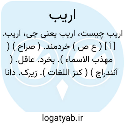 اریب. [ اَ ] ( ع ص ) خردمند. ( صراح ) ( مهذب الاسماء ). بخرد. عاقل. ( آنندراج ) ( کنز اللغات ). زیرک. دانا. ( وطواط ) ( آنندراج ). اَرِب. ج، ارباء. ( مهذب الاسماء ): ادیبی اریب.