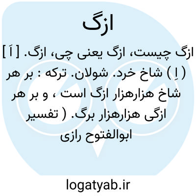 ازگ. [ اَ ] ( اِ ) شاخ خرد. شولان. ترکه: بر هر شاخ هزارهزار ازگ است، و بر هر ازگی هزارهزار برگ. ( تفسیر ابوالفتوح رازی چ 1 ج 5 ص 177 س 7 ). رجوع به ازغ شود.
