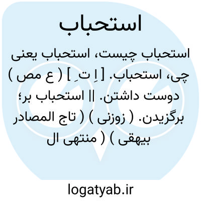 استحباب. [ اِ ت ِ ] ( ع مص ) دوست داشتن. || استحباب بر؛ برگزیدن. ( زوزنی ) ( تاج المصادر بیهقی ) ( منتهی الارب ). گزیدن بر. اختیار. ترجیح. نیکو شمردن چیزی را. ( از منتهی الارب ). || سزاوار شدن. || تا دیر ماندن آب در شکنبه شتر و تشنه ناشدن وی از آن. ( منتهی الارب ). || ( اصطلاح شرع ) مقابل وجوب، کراهت، حرمت و مترادف ندب است و هو ما یستحق فاعله المدح و الثواب، و لایستحق تارکه الذنب و العقاب.