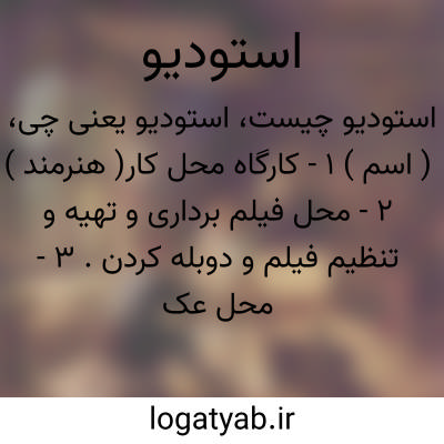 ( اسم ) ۱ - کارگاه محل کار( هنرمند ) ۲ - محل فیلم برداری و تهیه و تنظیم فیلم و دوبله کردن. ۳ - محل عکسبرداری نقشه کشی و جز آن.